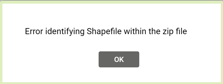 - “Error Loading Shapefile to Database” or “Invalid File – Please try again” or “Error identifying Shapefile within the zip file”