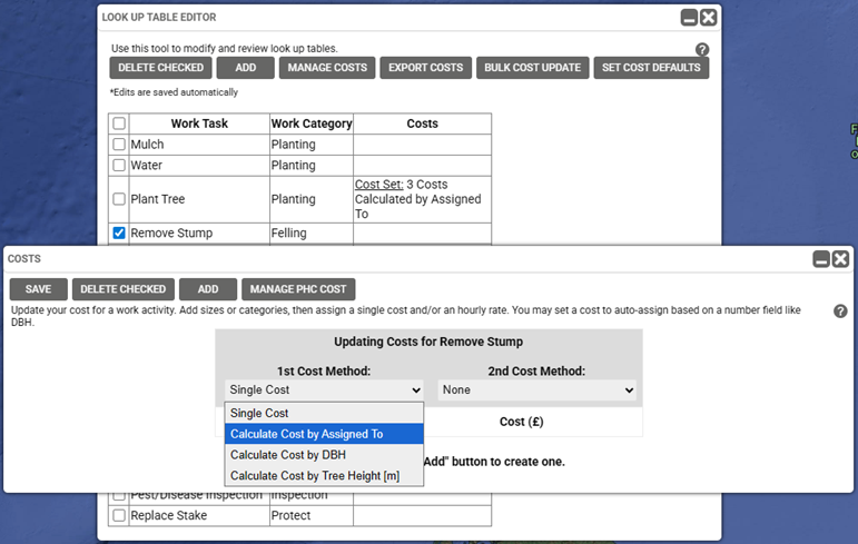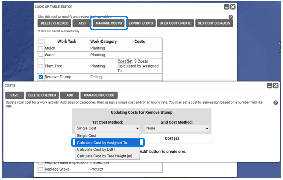 - Optionally, set a 2nd Cost Method if the cost also varies by tree height or DBH.