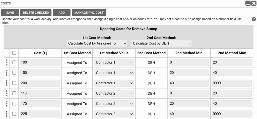 Do you use a Schedule of Rates (SOR) with multiple contractors, each with different prices for the same work? With TreePlotterâ„¢, your Work Task Costs table can be configured to record a different cost for each contractor, and even per height or DBH range. This document explains how this configuration looks in practice so you can decide whether it is a useful update for your organization.