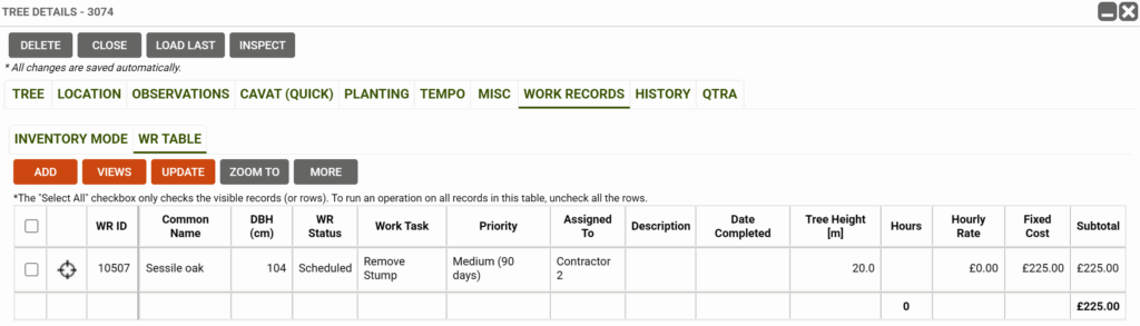 - When a new Work Record is created, the cost will use the person or contractor in the Assigned To field (and height or DBH, if applicable) and pull through the appropriate cost.